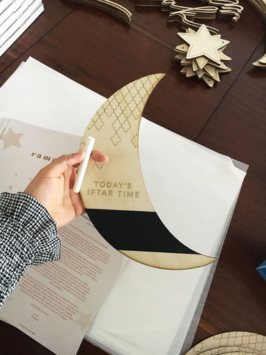 A minimal, yet festive, crescent moon with laser-etched patterns and hand-lettered text. It reads “Today's Iftar Time” and has a strip of blackboar...